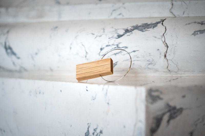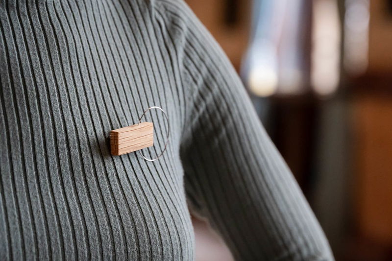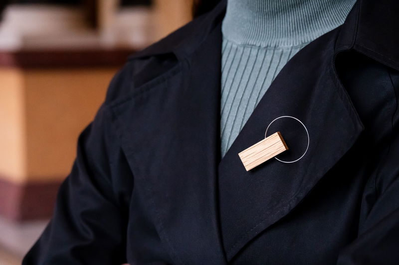 Brož Ladička je ručně vyrobená v dílně šperkařky Marie Poláčkové, která stojí za značkou KO-RA-LE. Tvoří ji dřevěný hranol s obručí z chirurgické oceli.