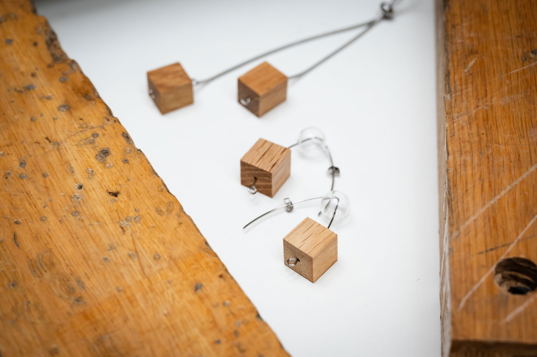 Rusalčiny perly tvoří dřevěné krychle z bývalého pódia, kuličky z foukaného českého skla a háček z nerezové oceli. Návrh vznikl ve spolupráci s designérkou značky KO-RA-LE Marií Poláčkovou. Náušnice lze zakoupit samostatně nebo v setu s náhrdelníkem Dvořákovy kostky.
