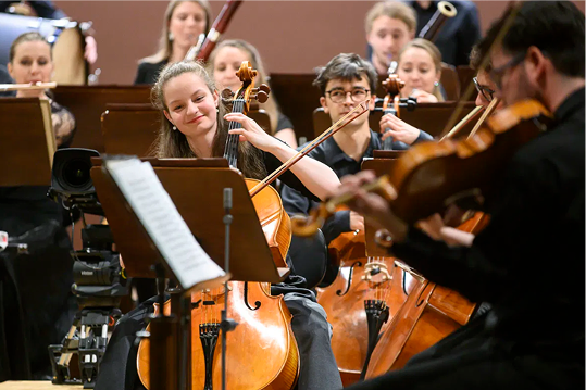 Mladí hudebníci po boku předních hráčů orchestru – na zkouškách, koncertech i zájezdech.